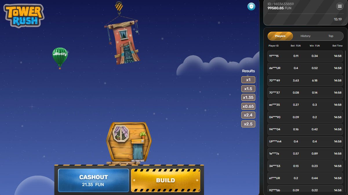Tower Rush doesn’t have a traditional difficulty selector, but your real risk management happens through how aggressively you stack floors before cashing out. The deeper you go, the bigger the multiplier, and the bigger the fall.